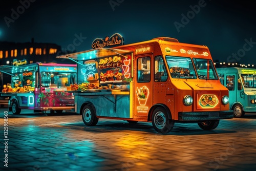 A colorful food truck rally with vibrant neon lights offering delicious street food in an urban landscape, creating a festive and inviting dining experience at night.