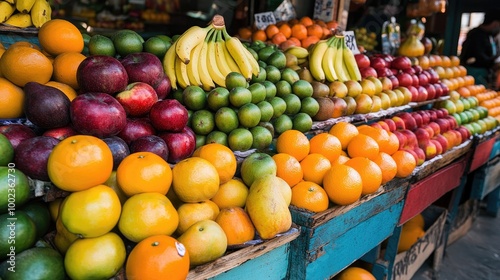 a colorful fresh fruit stand at a market, filled with a variety of fruits like apples, oranges, and bananas, freshly picked and ready for sale.