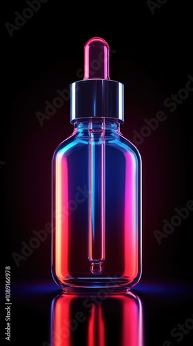 A colorful glass dropper bottle illuminated with vibrant lighting effects.