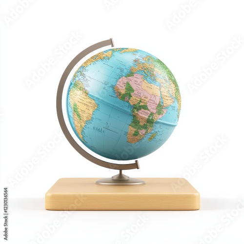 A colorful globe on a wooden base, showcasing continents and oceans, perfect for educational purposes or home decor.