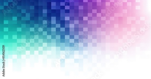 A colorful gradient background with pixelated squares transitioning from blue to pink.