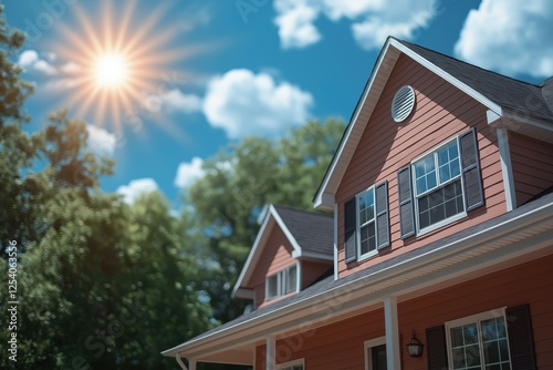 house, colourful, blue, sky, sun, ray, greenery, tree, cloud, charming, architecture, exterior, landscaping, daytime, warmth, idylli, peaceful, residential, nature, light, shadow, relaxing, sunny, home