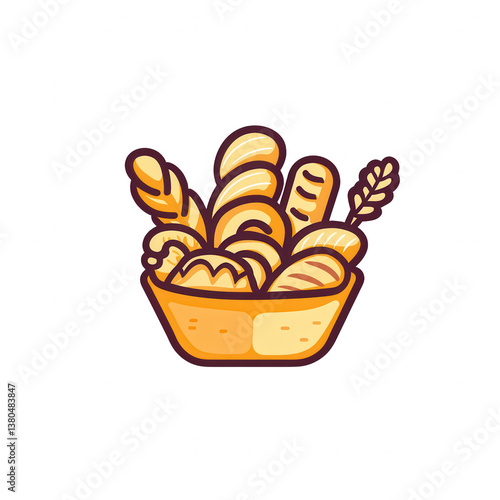 A colorful illustration of a basket filled with various types of bread, showcasing croissants and baguettes, perfect for bakery themes and food-related designs.