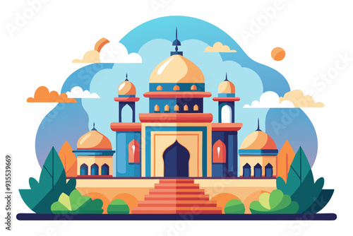 mosque, grand, colourful, illustration, building, architecture, islam, muslim, faith, religious, spirituality, prayer, worship, dome, minaret, arch, window, door, step, stair, garden, greenery, foliage, plant, leaf, sky, cloud, sun, white, blue, yellow, orange, red, green, brown, art, design, flat, graphic