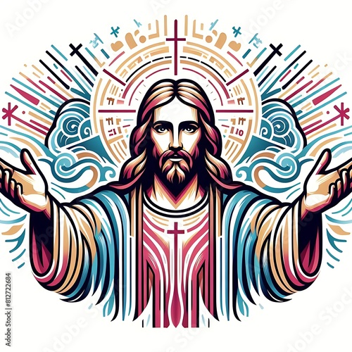 a, colourful, illustration, of, jesus christ, illustrator, bible, christianity, god, holy, religious, religion, biblical, christian, hope, saint, church, history, faith, ancient, colours, people, white, design, jerusalem, israel, catholic, jesus christ, with, his, arm, out, art, used, for, printing, card