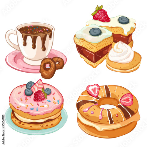 A colorful illustration of assorted sweet treats, including a cup of hot chocolate, cake, and donuts.