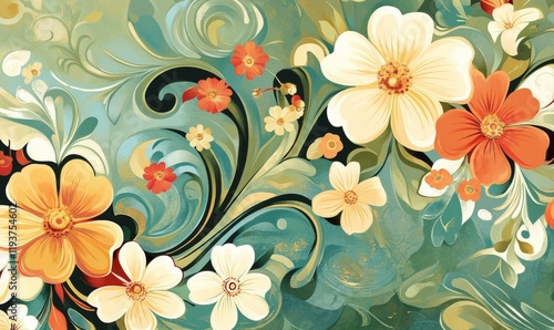 A colorful mix of spring blooms on an elegant abstract floral background with intricate details, intricate, elegant, patterns.