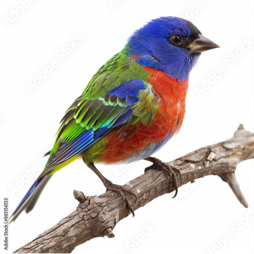 A colorful painted bunting with its bright blue, green, and red feathers, perched on a branch, isolated on white background.