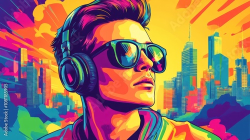 A colorful pop art style poster of an attractive young man wearing headphones and sunglasses