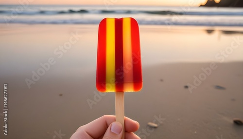 popsicle, beach, sunset, hand, summer, treat, sand, ocean, sky, wave, colourful, red, yellow, striped, food, sweet, refreshing, vacation, holiday, travel, dessert, fruit, glacé, coast, shore, daylight, natural, beauty, joy, happiness, fun, relaxation, peace, calmness, warm, glowing, gold, horizon, sea, water, person, holding, closeup, vertical, background