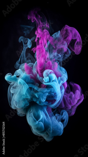 A colorful smoke trail is shown in the air. The smoke is a mix of blue, purple, and pink. Concept of creativity and artistic expression