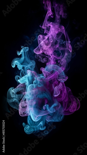 A colorful smoke trail is shown in the air. The smoke is a mix of blue, purple, and pink. Concept of creativity and artistic expression