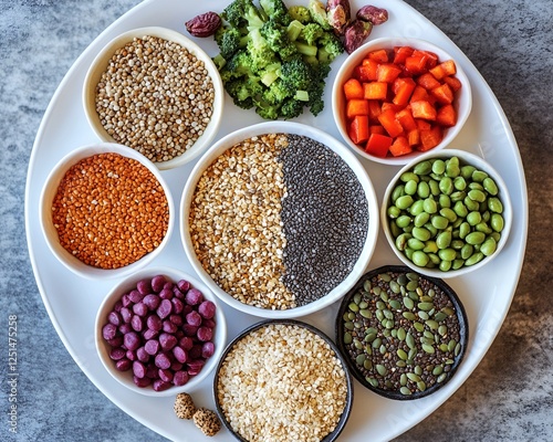 A colorful spread of plant-based meals, featuring grains, vegetables, and superfoods on a clean white plate, symbolizing the latest healthy eating trends