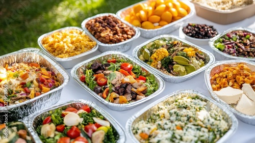 A colorful spread of various dishes in aluminum trays, featuring salads, grains, and fresh produce, perfect for a picnic or outdoor gathering.
