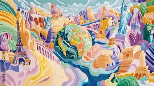 A colorful, surreal landscape featuring famous landmarks around a globe.