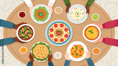 A colorful table spread with various dishes, highlighting a communal meal with hands reaching for food, promoting sharing and togetherness.