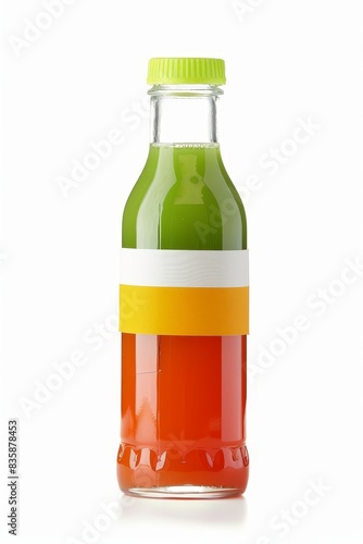 A colorful vegetable juice bottle with a modern label, set against a clean white background with space for text on the side. Perfect for promotional materials.