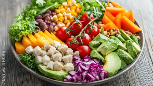vegetable, healthy, salad, bowl, food, nourishment, fresh, tomatoes, corn, bean, avocado, lettuce, greener, carrot, onion, meal, vegetarian, colourful, ripe, cut, diced, sliced, chopped, vegan, cookery, dietary, ingredient, wooden, table, organic, plate, texture, eating, wellness, vibrant, appetising, macro, closeup, arrangement, detail, grain, raw, studio, background, close, side