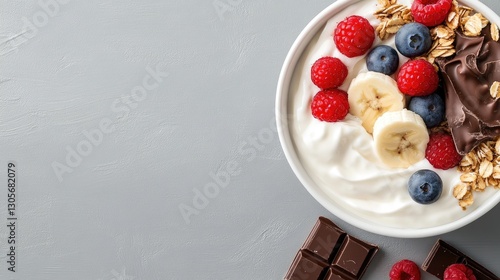 A colorful yogurt bowl is artfully arranged with sliced bananas, raspberries, blackberries, granola, and chocolate drizzle, creating an appetizing and healthy snack.