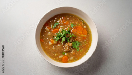 A comforting bowl of lentil soup with carrots, celery, and onions, garnished with fresh parsley, served in a white bowl. Perfect for cozy meals, wellness recipes, or wholesome food visuals