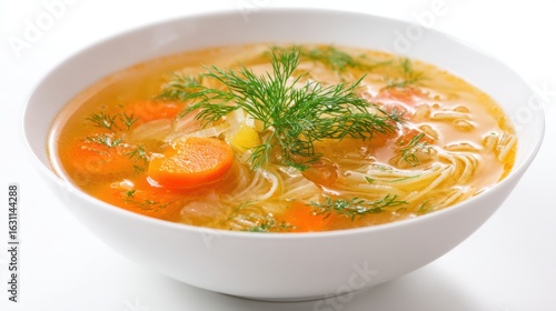 A comforting bowl of vegetable soup features colorful carrots, tender noodles, and aromatic herbs. This nourishing dish is perfect for chilly days or any meal.