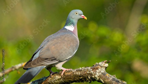 A common wood pigeon perched on a branch, showcasing its plumage and profile against a blurred green background