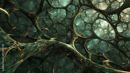 A complex abstract design of tangled, organic lines in shades of green and brown, resembling a dense, chaotic forest canopy from above.