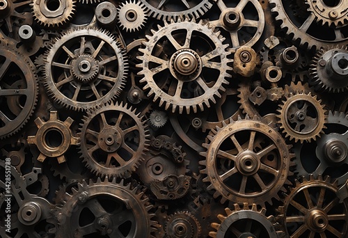 a complex arrangement of aged, metallic gears and cogs creates a densely textured and darkly dramatic steampunk aesthetic.