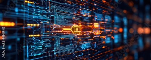 A complex, multilayered security system protecting global networks, with visualized encryption algorithms and secure data flows