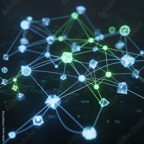 A complex network of glowing, interconnected shapes in teal and lime green illuminates a dark background.