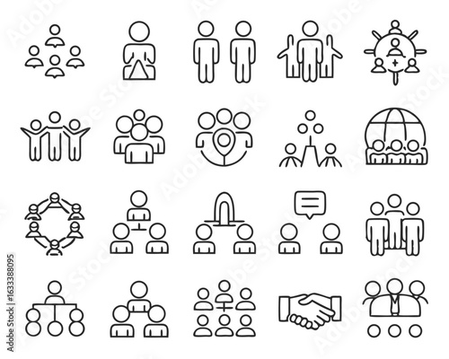 business, teamwork, collaboration, icon, set, thin, line, graphic, design, concept, symbol, illustration, people, group, meeting, discussion, partnership, strategy, success, project, communication, organisation, company, work, office, synergy, connection, support, transparent, background