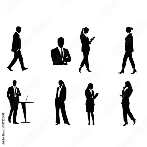 A comprehensive collection of vector silhouettes showcasing male and female office professionals in various work-related poses. These figures depict activities such as using laptops, talking on phones