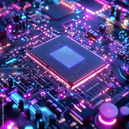 a computer chip with glowing lights, inside a circuit board, in blue and purple colors, with a blurred background.