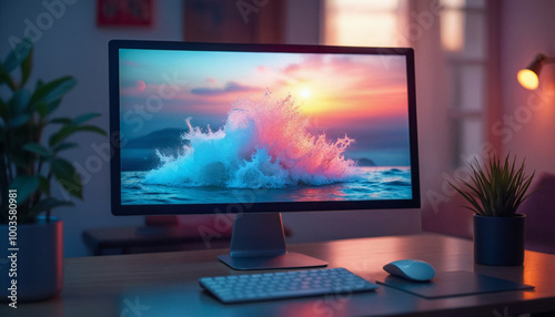 computer, monitor, splash, water, screen, foreground, background, sunset, technology, desk, keyboard, mouse, work, office, modern, display, business, table, workplace, desktop, white, workspace, room, design, space, interior, digital, blank, laptop, communication, home, cyberspace, nobody, network, empty, mobile, web, creative, phone, place, equipment, plant, wood, device, hipster, lamp, template, cyberspace