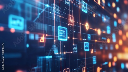 A computer network with icons and lines representing data processing, symbolizing global finance, business connections, and computing.