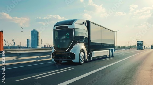 A concept of a self-driving delivery truck on a highway, logistics, dynamic and dramatic compositions. Background for business