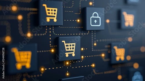 A conceptual 3D render of an interconnected e-commerce web with digital payment icons and delivery symbols. High resolution, no excessive blur.