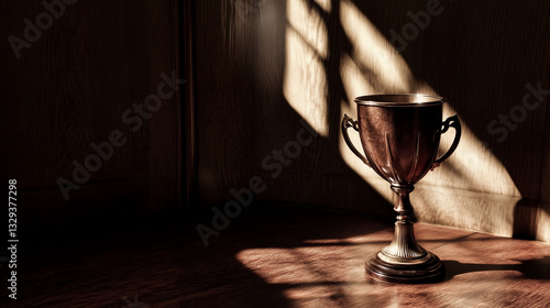 A conceptual scene of a trophy on a wooden table, sunlight casting a shadow, photorealistic.
