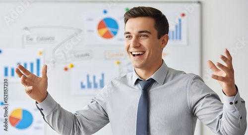 A confident businessman delivers a presentation with passion, backed by detailed charts and graphs, exuding expertise and enthusiasm.