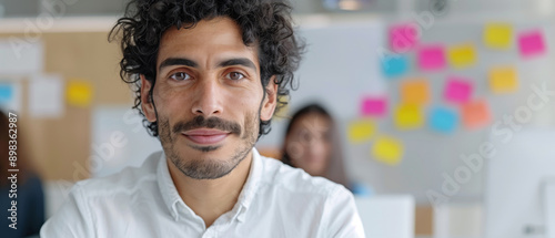 A confident businessman with curly hair and a white shirt in a modern office setting, with colorful sticky notes on the wall behind him.