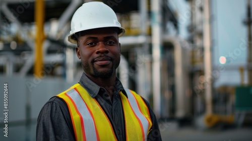 A confident engineer, captured in a professional headshot, wearing safety gear and standing against an industrial backdrop, symbolizing expertise and dedication to their craft.