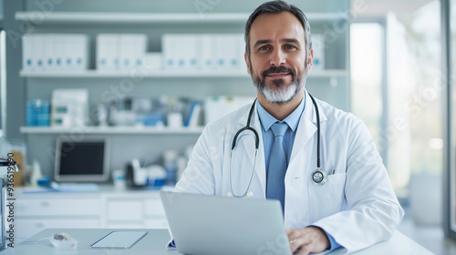 A confident general practitioner in a clinic office, engaged with their laptop computer. The doctor is smiling at the camera, ready for patient appointments, with a well-organized