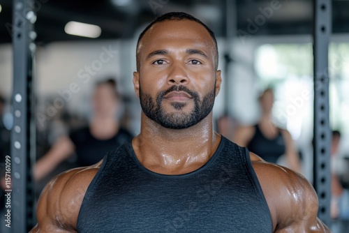 A confident man in a tank top stands proudly at a modern gym, embodying strength and perseverance with a strong focus amidst a vibrant fitness community.
