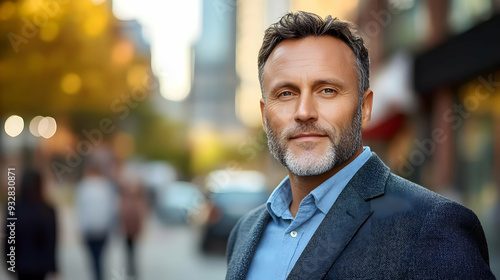 man, confident, mature, adult, walking, city, street, urban, urban life, blazer, jacket, suit, business, professional, smile, happy, portrait, head shot, face, beard, grey hair, looking, camera, people, blur, background, daylight, daytime, fashion, style, lifestyle, casual attire, outdoors, public