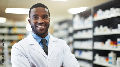 A confident pharmacist in a white coat smiles warmly, surrounded by organized shelves of medicine in a bright pharmacy.