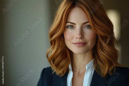 redhead, woman, portrait, confident, professional, business, businesswoman, wavy hair, curly hair, red hair, freckle, green eye, smiling, model, attractive, beautiful, stylish, elegant, fashion, corporate, office, head shot, serious, successful, leadership, powerful, female executive, career, ambition, achiever, determination