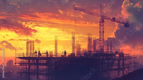 A construction site at sunset with engineers reviewing progress, cranes, and scaffolding in the background. The sky is painted with warm colors.