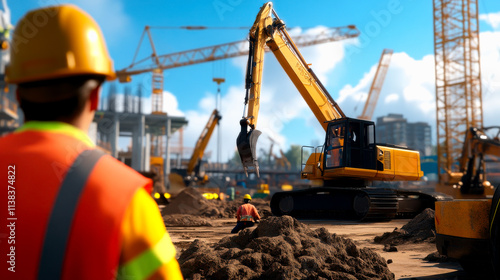 A construction site bustling with activity, featuring heavy machinery and workers in safety gear under a bright blue sky.