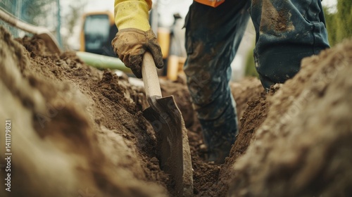 A construction worker digging a trench for plumbing installation. Featuring hard work and focus
