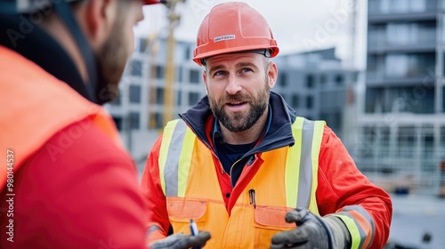 A construction worker in safety gear engages in conversation at a building site, showcasing teamwork and communication.
